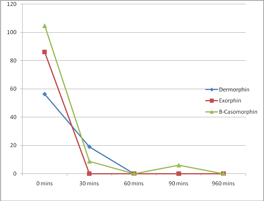 Dermorphin was digested at a marginally slower rate than the exorphins derived from wheat and milk.